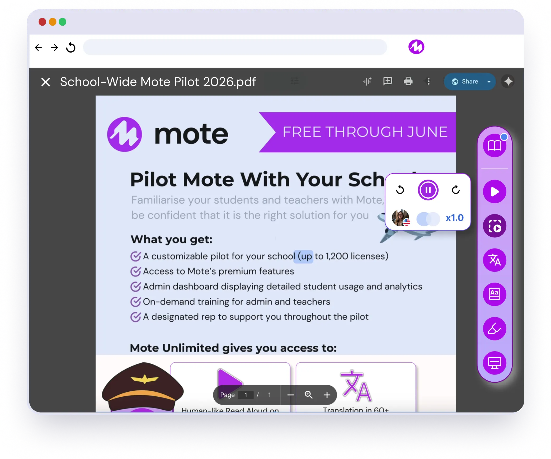 A fourth grader who recently arrived from Guatemala should not have to choose between understanding the lesson and building English skills. With natural voices across 60+ languages and live translation built in, Mote lets multilingual learners hear content in their home language while following along in English - or the other way around.